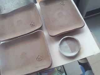 お肉の入ってた発泡トレイを使って形作った角皿3枚と粘土2種類で作った小皿です。