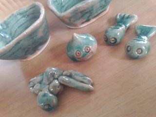 紐作りの小鉢と金魚の箸置き、アリ(?)の箸置き、スライムオブジェ。